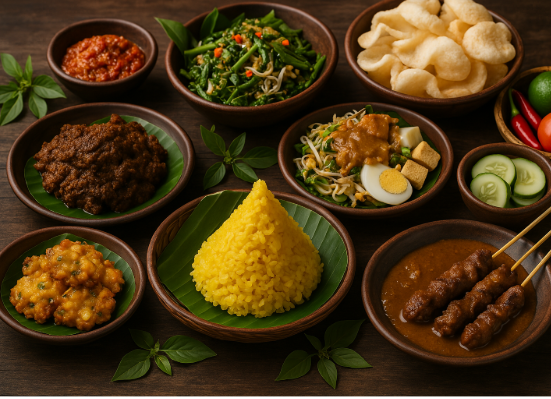 kuliner Indonesia, makanan khas daerah, street food Indonesia, nasi tumpeng, rendang, gudeg, pempek, sate lilit, makanan tradisional, wisata kuliner Nusantara, indotaste, masakan Indonesia, kuliner enak, makanan lezat Indonesia, kekayaan rasa Nusantara